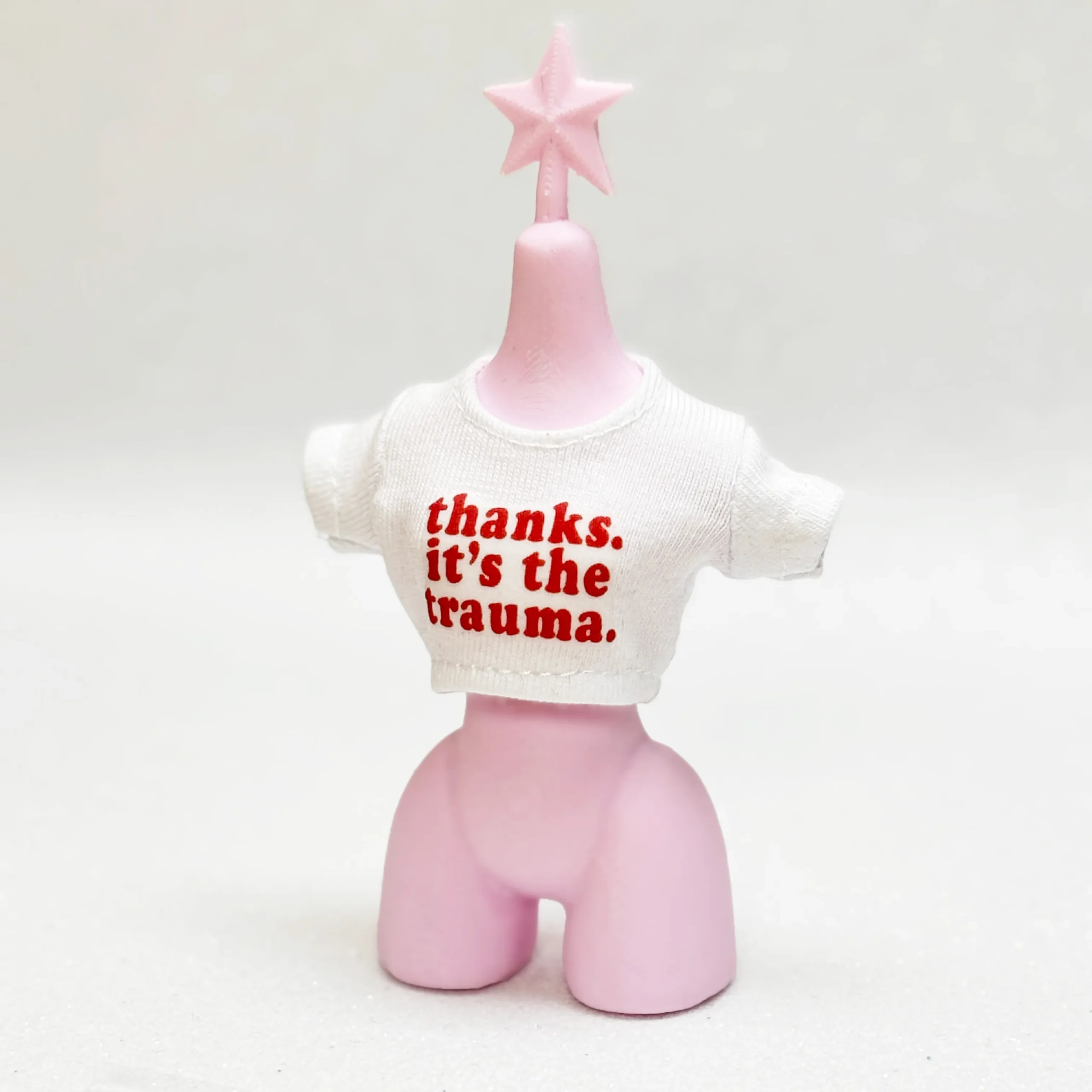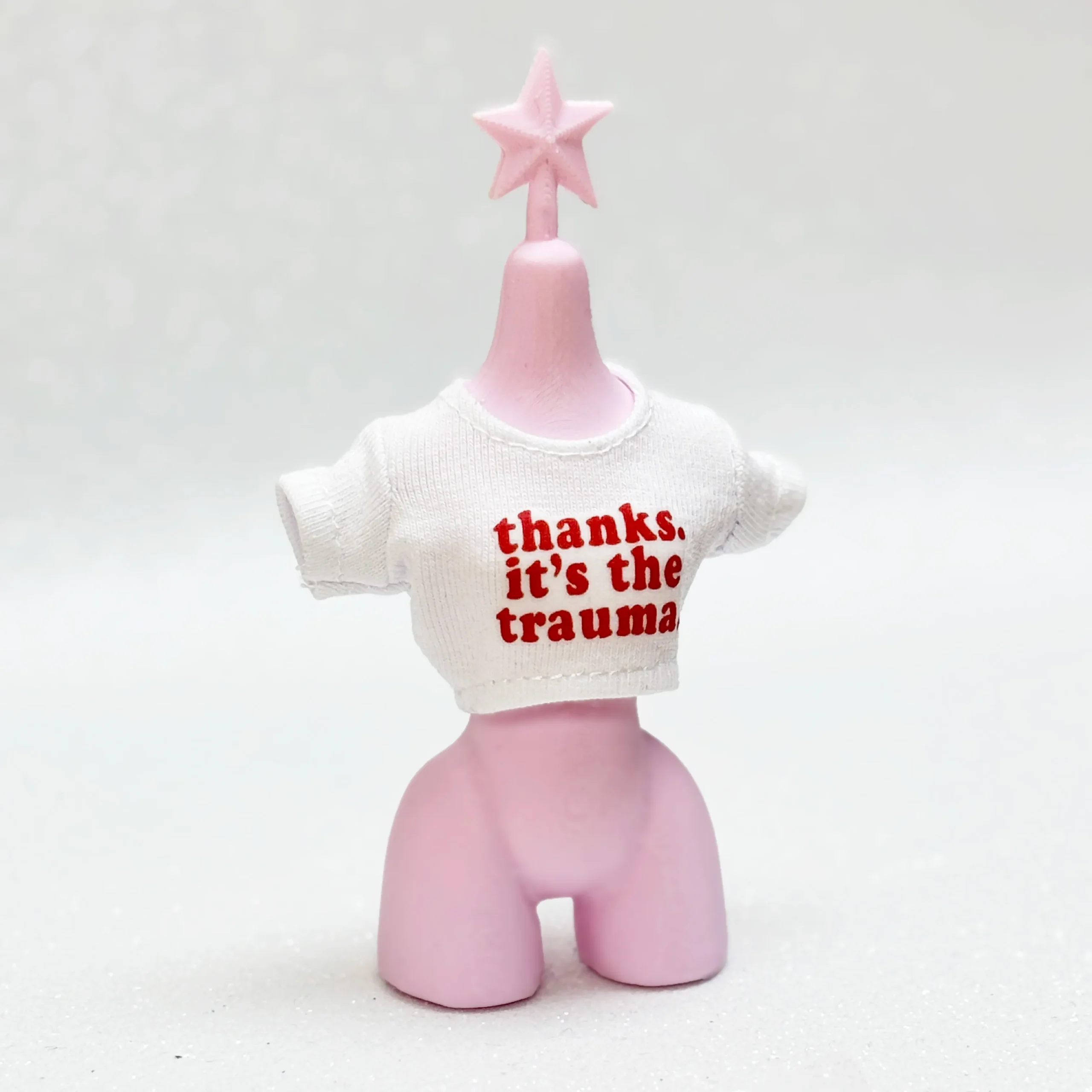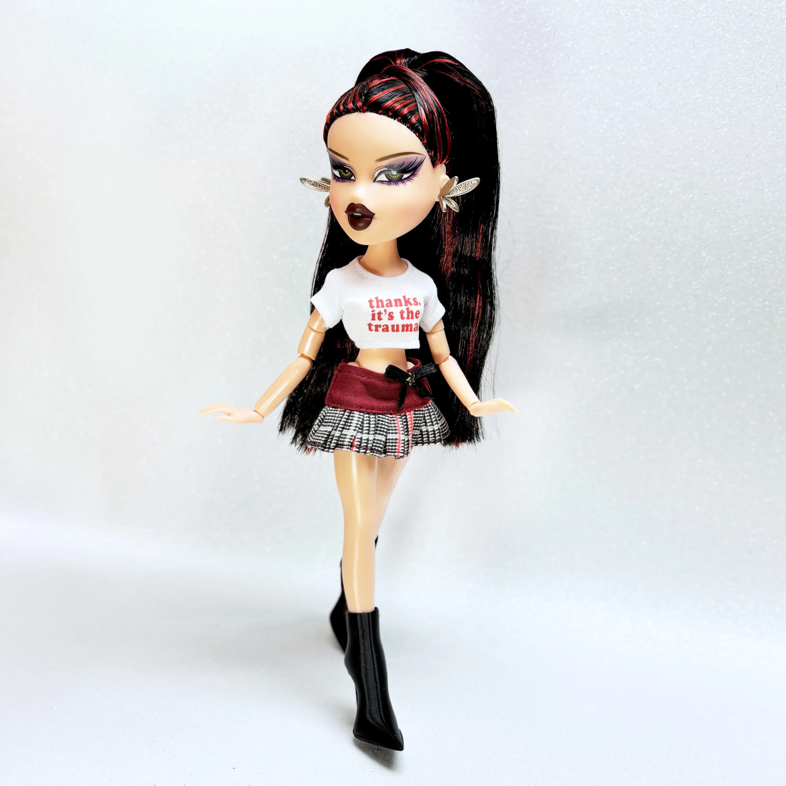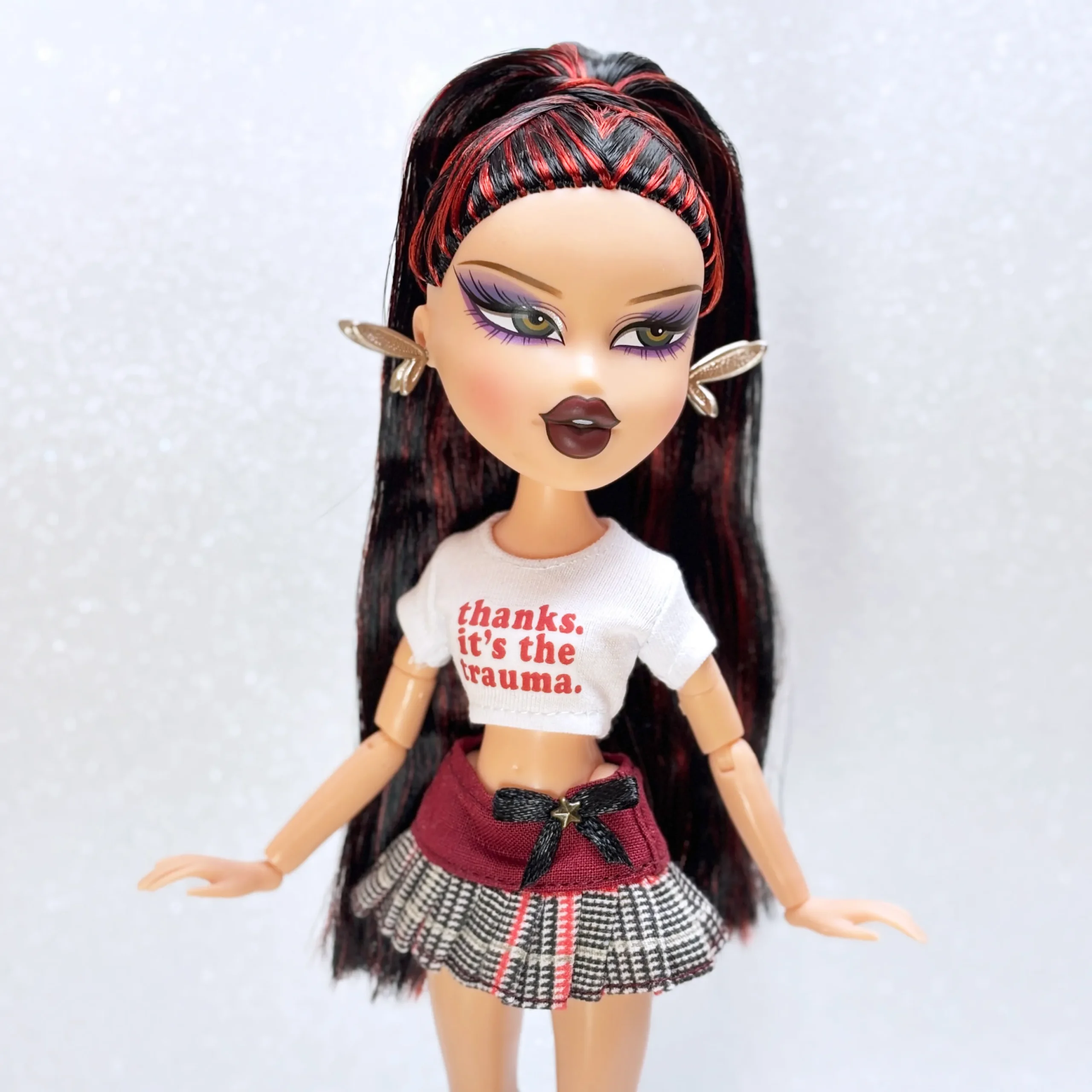 Printed T-shirt with the phrase “Thanks, it’s the trauma.” A tongue-in-cheek, ironic statement full of attitude and personality, perfect for edgy, expressive Bratz looks.
